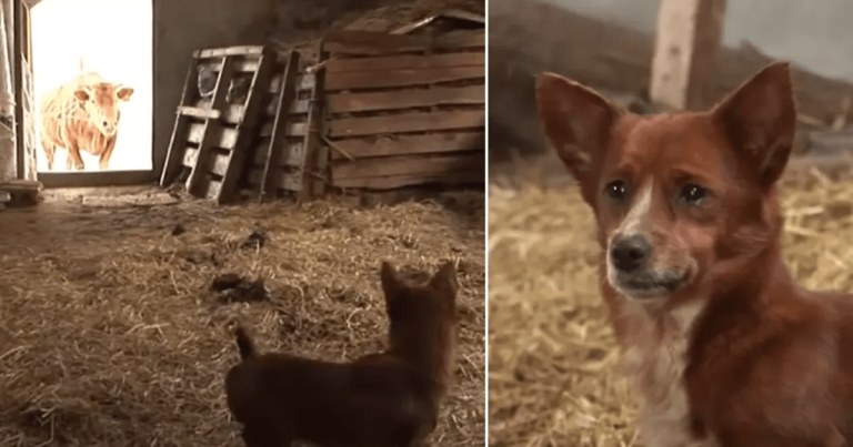The farmer dragged the cow outside of the barn, it was time for the cow to meet her new owners. Rookie, witnessing the scene, couldn’t believe that he was being separated by his mom. You can see his eyes glistening with tears. The little pooch started barking and barking, but the farmers didn’t cancel the transaction.