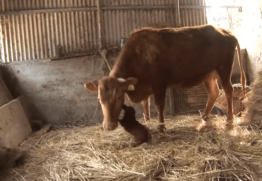 The little dog after losing his mom started to spend more time in the barn where he befriended the cows living there. Rookie soon became really attached to one of the cows which in turn decided to “adopt” him as her son.