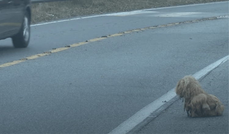 After a few bites and some water, they watch as Boksil crawls under the gate. Now they can get to her if she will let them. Boksil makes her way over to the road, carrying her heavy matted fur, and just sits there. It’s truly a heartbreaking thing to see. She watches as each car passes by hoping one of them will stop and her owner will come home.