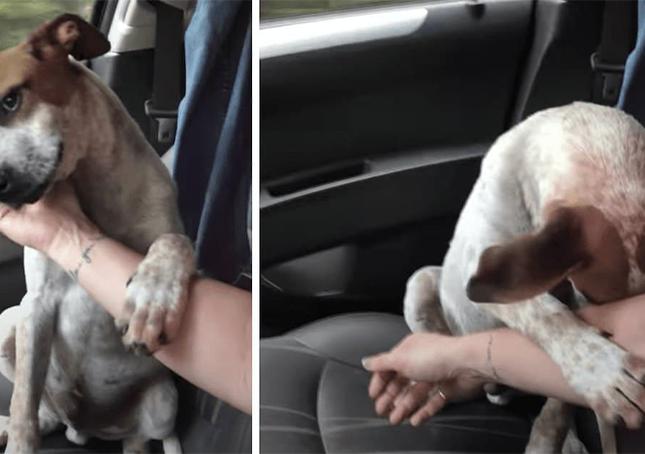 As the woman sobbed on the drive home, she recorded a video of the sweet dog sitting beside her. She pets the dog and tells him it’s okay through sniffles. But to her surprise, the dog grabs her arm in response. He seems to be holding her hand to comfort her and to say thank you.