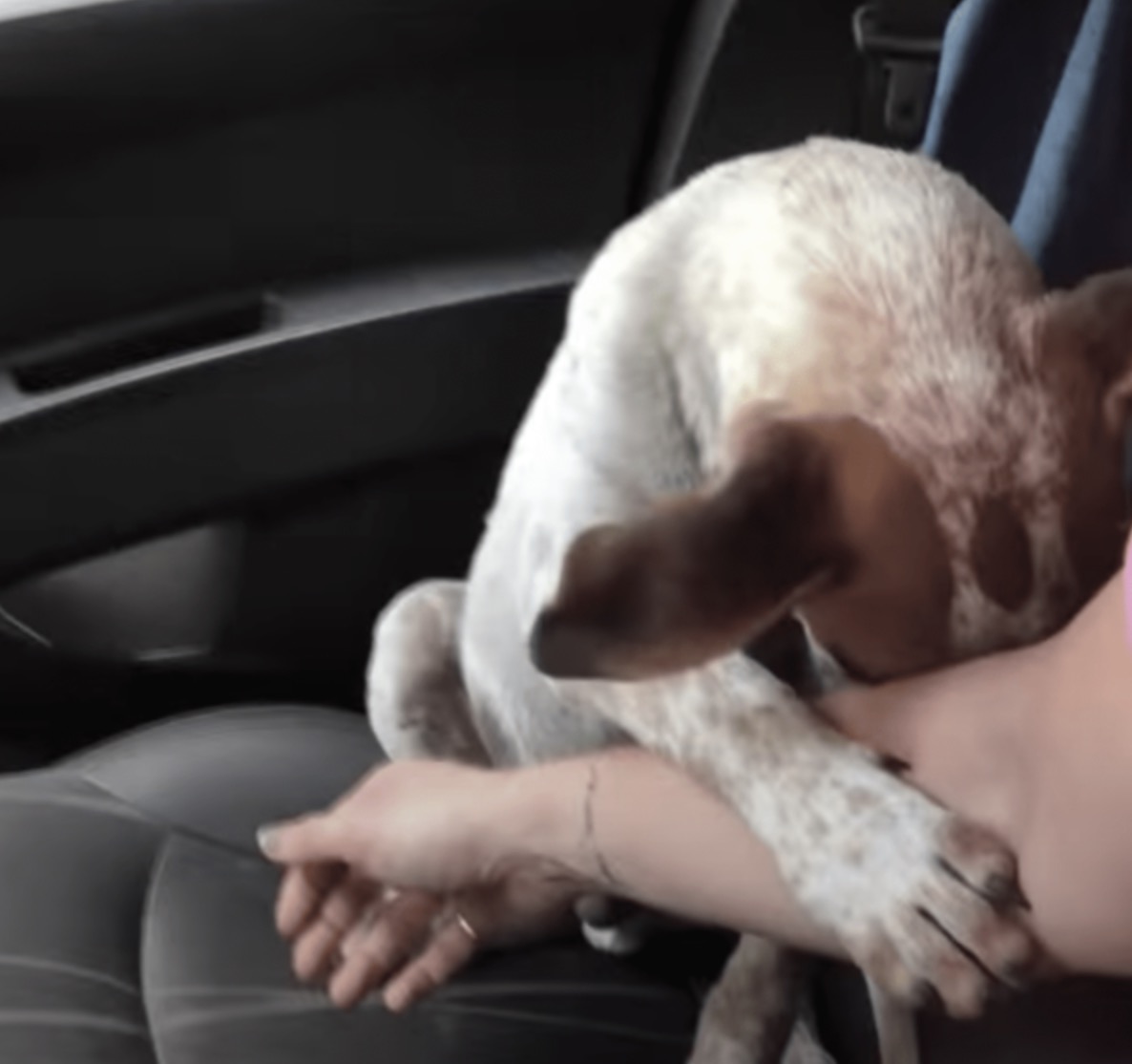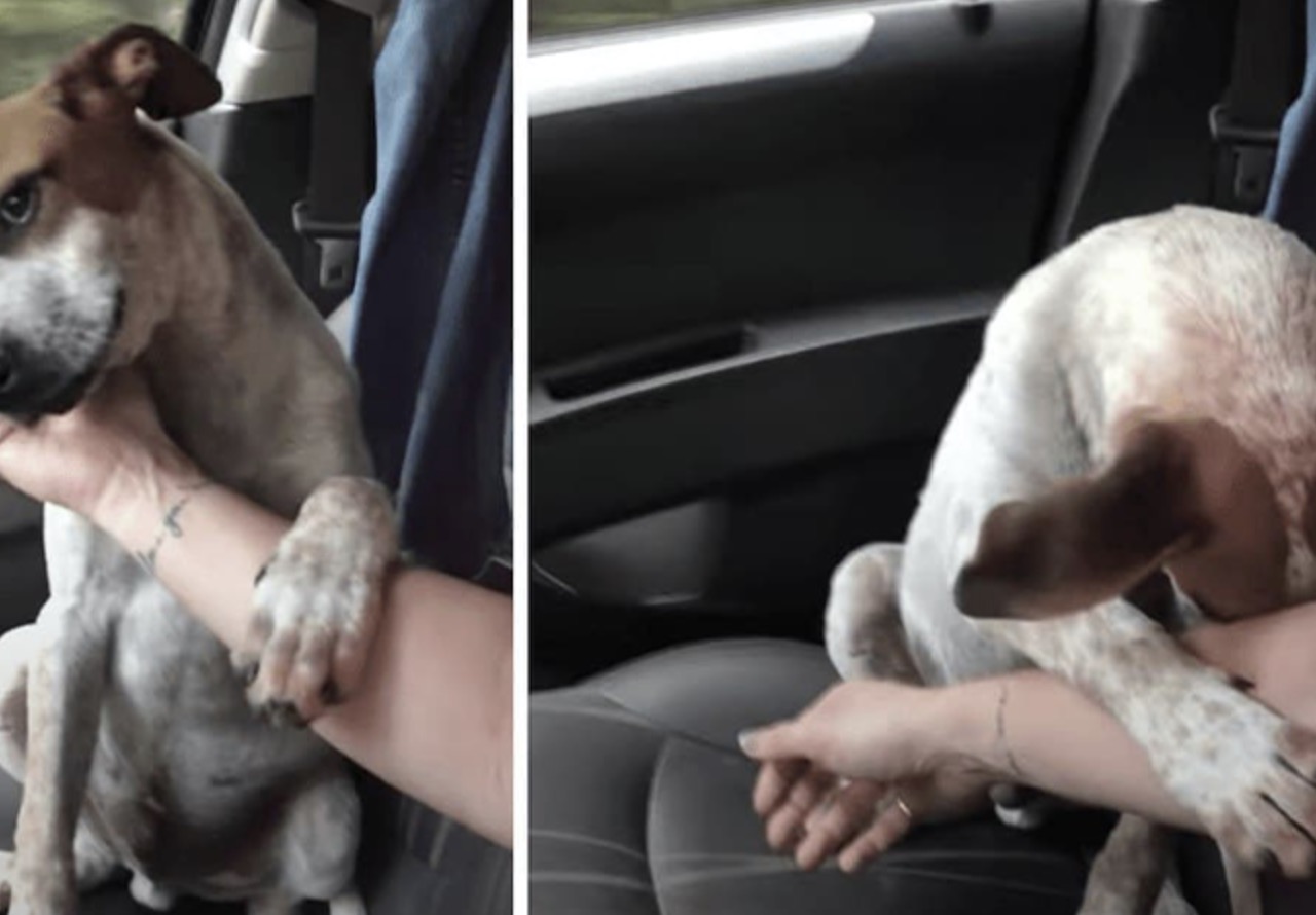 As the woman sobbed on the drive home, she recorded a video of the sweet dog sitting beside her. She pets the dog and tells him it’s okay through sniffles. But to her surprise, the dog grabs her arm in response. He seems to be holding her hand to comfort her and to say thank you.