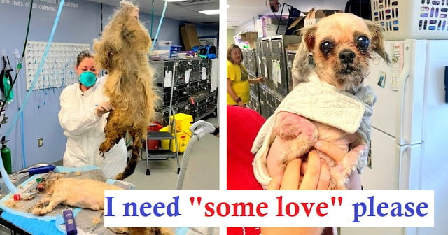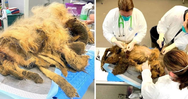 Ellie revealed herself as a sweet 11-pound dog, after removing grit, feces, and cocoon of hair. They then took her for surgery to repair a hernia and a few dental work.
