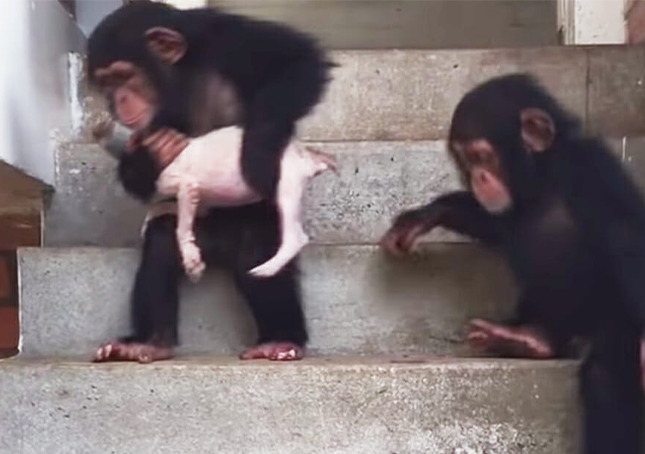 The chimpanzees immediately fell in love with Snafu and not only loved her and helped her but were always on hand to be her fun playmates.