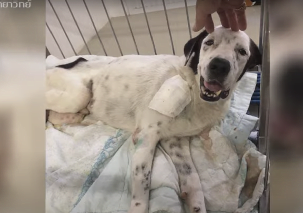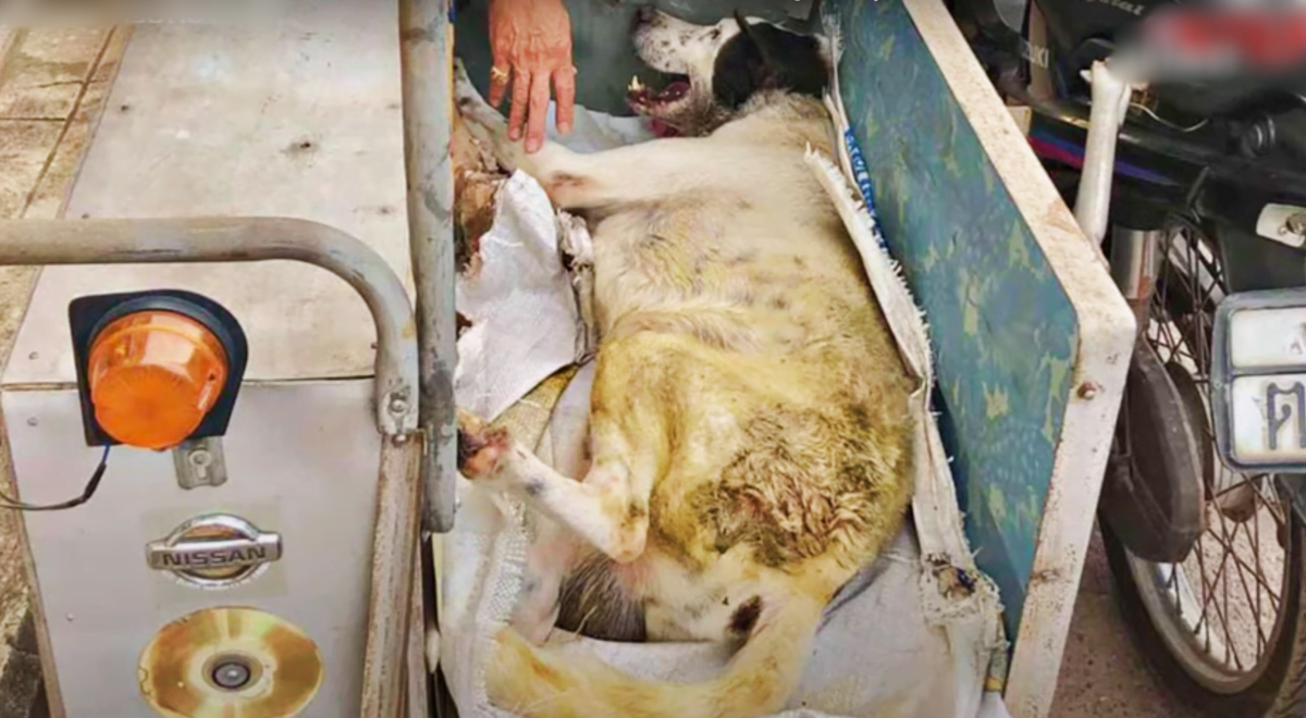 The local rescuer stepped up and decided he would take the dog into his care despite his grave condition. What amazed the rescuer was how much pain the dog was in and how long he had gone without food and water… yet when he was loaded into the vehicle, he looked up at the kind man and smiled. Despite so much pain and uncertainty, the dog understood that he now had a real fighting chance.