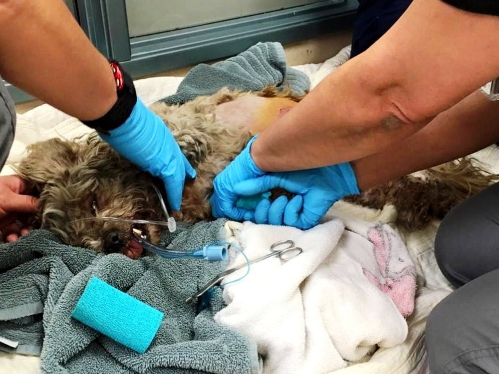 After much struggle, the cops were able to ward off the aggressive dogs, but Mr. Snuggles had collapsed from his injuries by then. His stomach was completely torn off due to bite wounds and dirt and debris were seeping into his intestines.