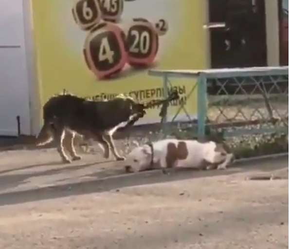 Timchenko and a friend were visiting a store in the town of Novorossiysk, Russia, when they noticed a pit bull tied up out front. The dog had been left there by his owner who was inside, shopping, however, the other dog that was passing by did not know that.