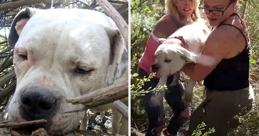 Tarzan, a Pit Bull mix, was living by the freeway next to a dense forest. The locals would always notice him and feed him. But soon, they noticed that Tarzan had been missing for several weeks. They realized that he was stuck deep inside the bushes, and called “Hope For Paws” for help.