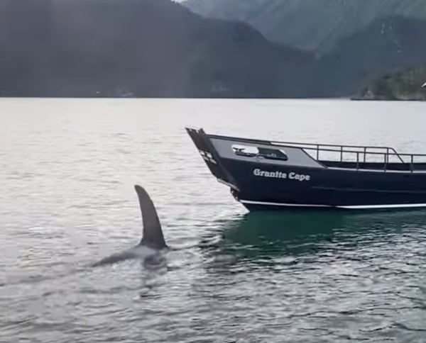 The very close encounter lasted a while, as the otter eventually plunged back into the water once the killer whale distanced himself from the boat.