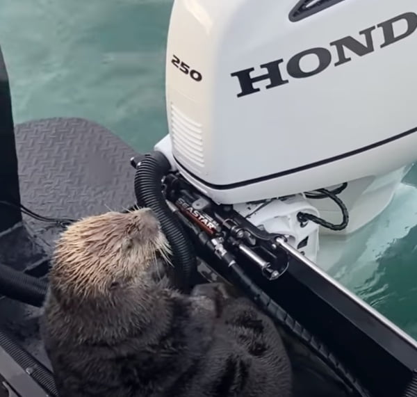 All of a sudden, the otter pops up out of the water and takes refuge on the boat with Donellas, who cannot believe what he is seeing.