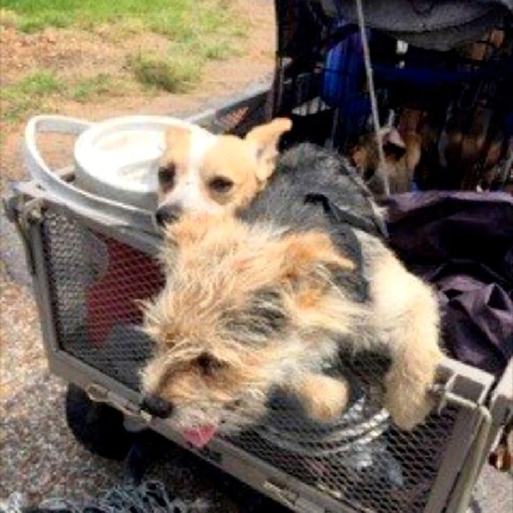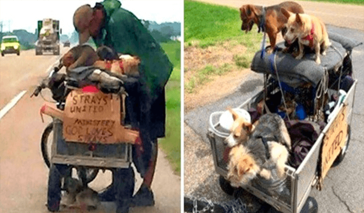 Woman Sees Homeless Man Pushing Cart Full Of Stray Dogs, Stops To Ask His Story