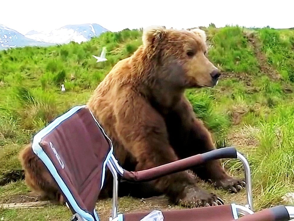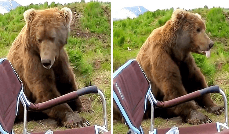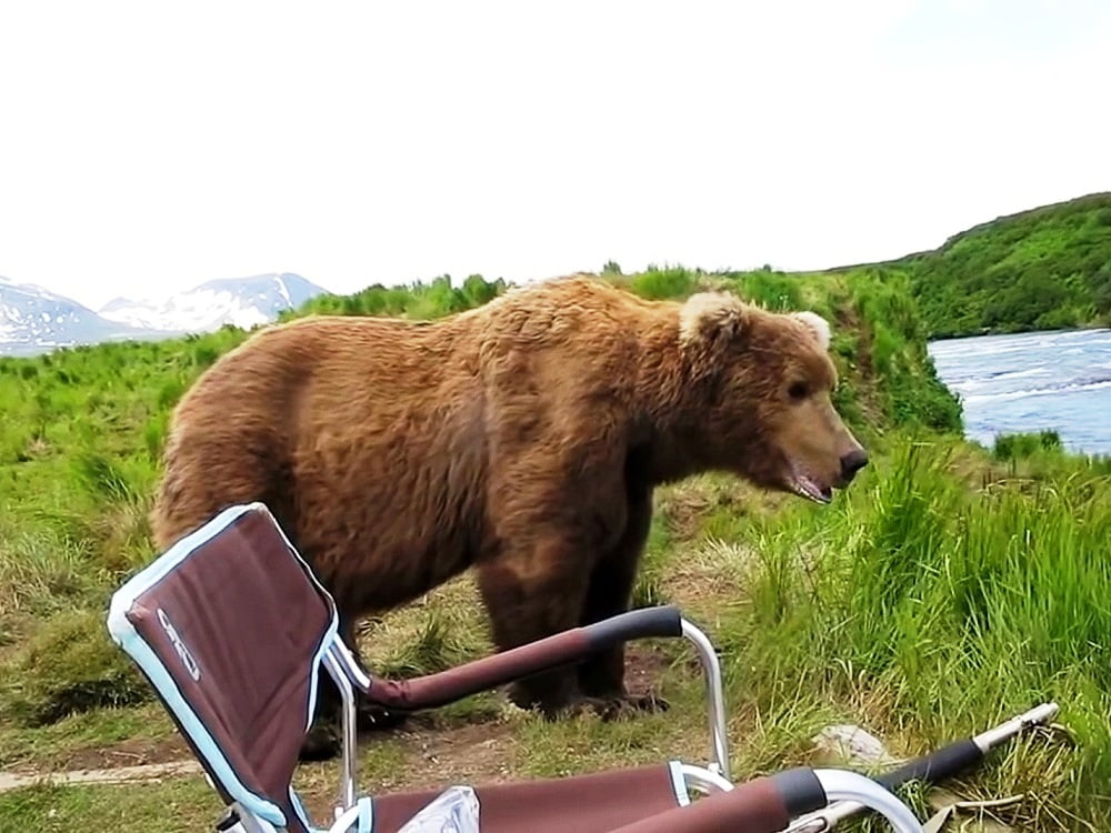 As recounted by Drew, the gigantic bear had just woken up from a nap while the rest of his bear family was playing down the river. For some reason, the bear was intrigued by Drew’s laidback body language as he soaked in the scenic surroundings. The bear strolled to a spot next to Drew’s chair, and began gazing at the abundant nature with a sense of wonder!