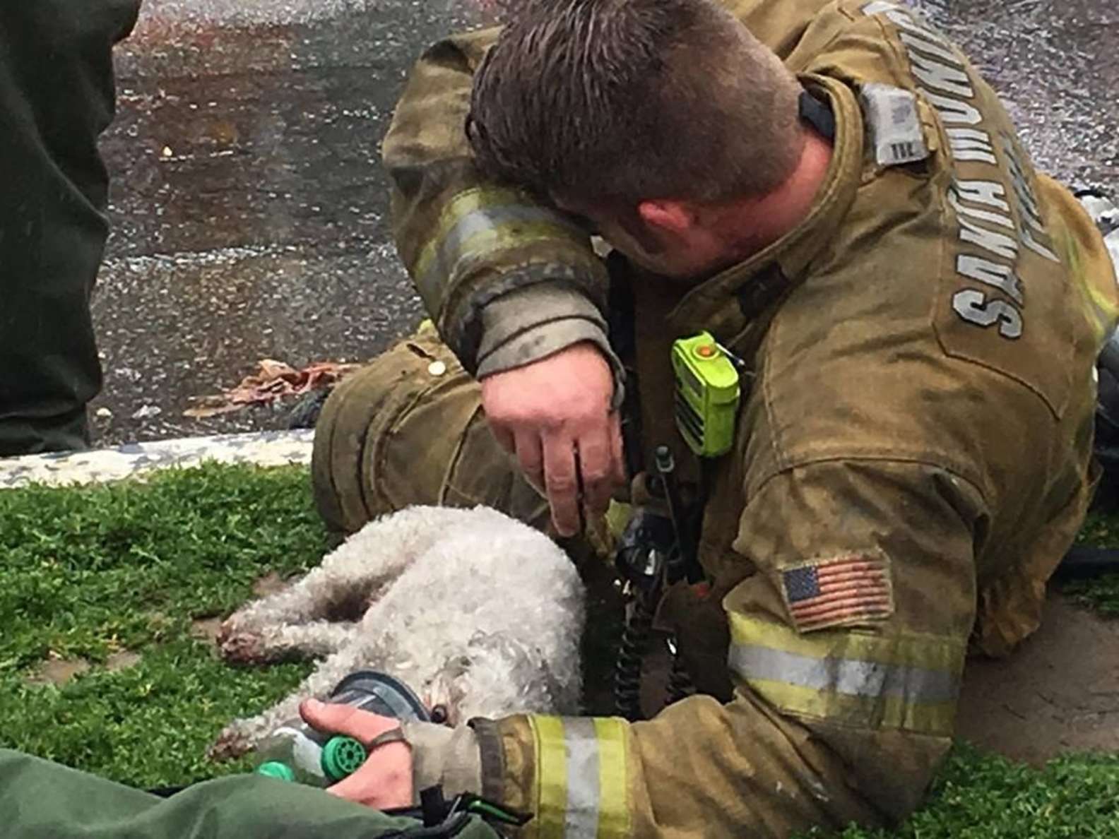 “As I was standing outside, I saw the firefighter, Mr. Klein, running toward the curbside grass area carrying something,” Fernando told The Dodo. “I didn’t know what it was at first, but then I realized that it was a pet who had been trapped in the fire. The dog was unconscious, limp and not moving at all.”