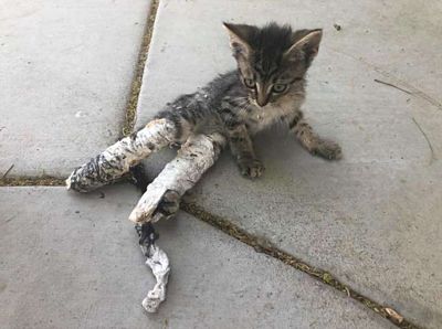 Her rear legs, apparently broken earlier, had been wrapped in some sought of crude casts? As soon as Kathy arrived she knew this little kitten had to be taken to her vet for evaluation of those legs.