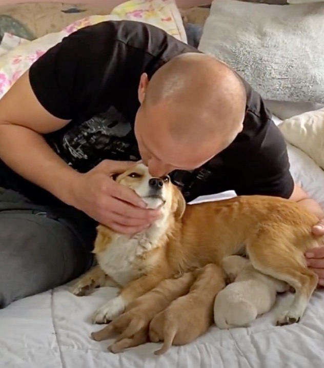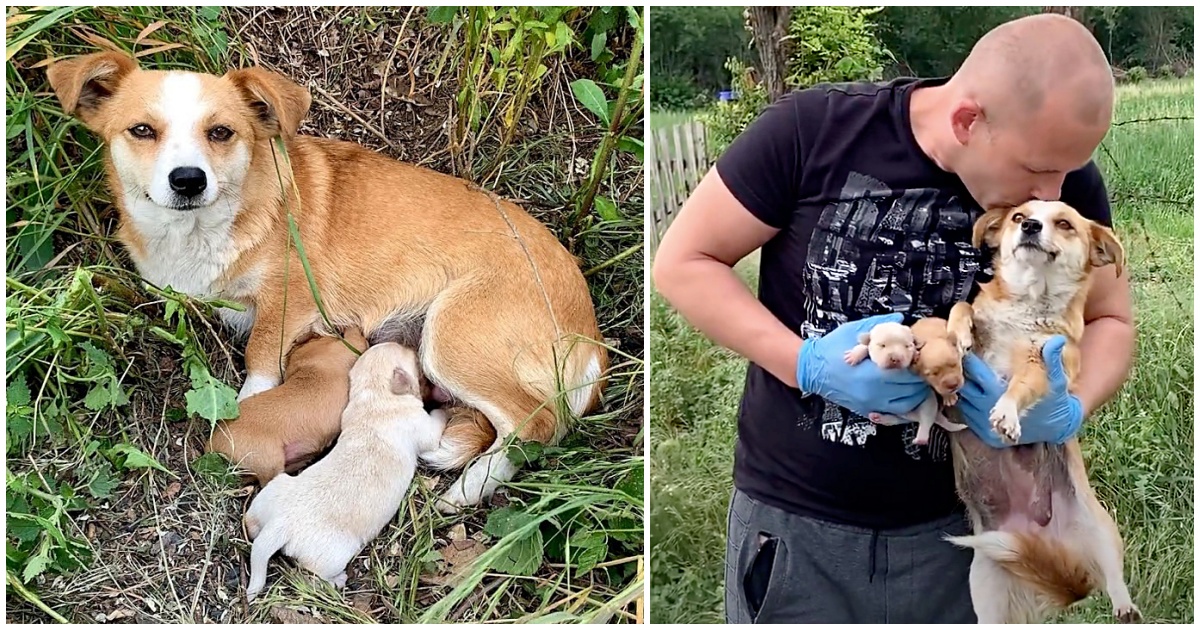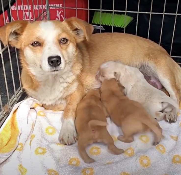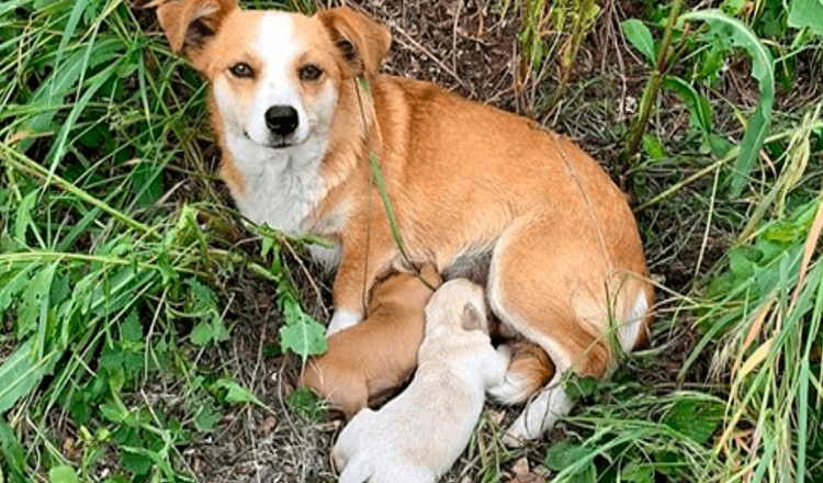 When rescuers arrived, she was hiding in the grass beside the road with her babies, trying to protect them while she waited for her owners to come back for her.