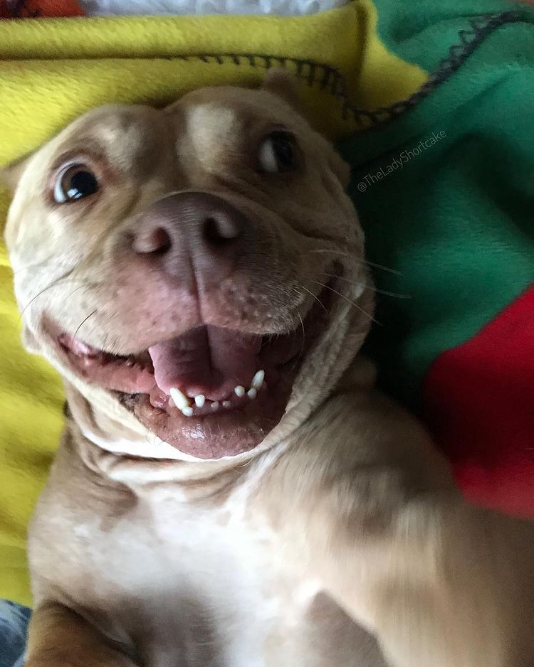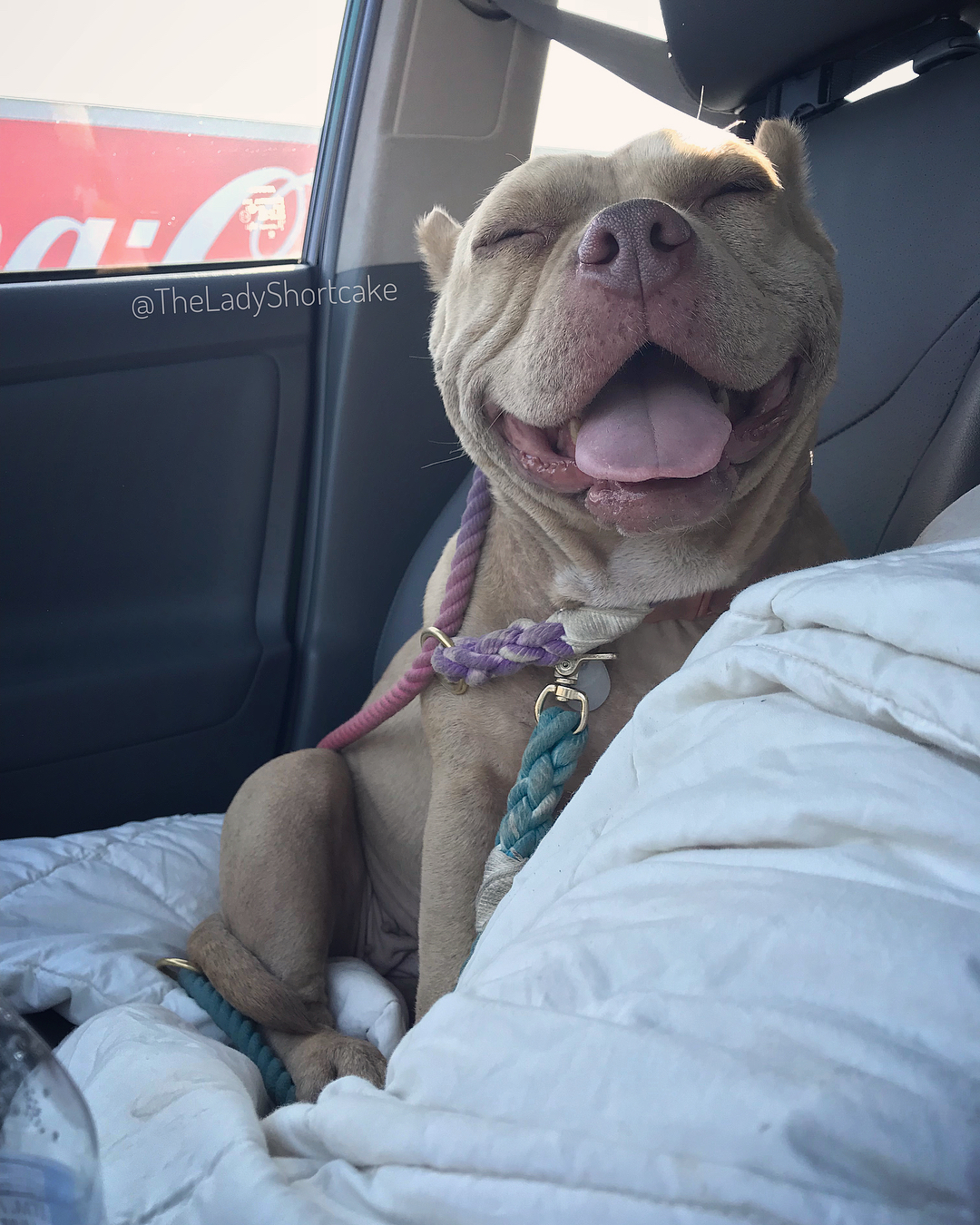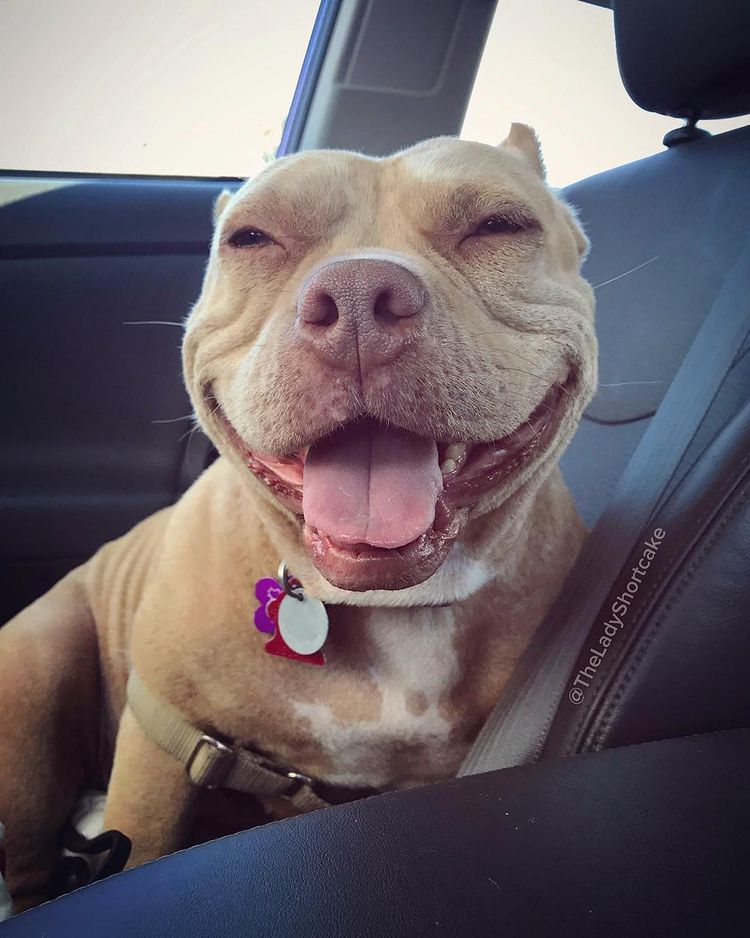 Lady Shortcake the 6-year-old Pit Bull has the most beautiful smile. It was one of the reasons her human fell in love with her, and now that she’s adopted, she smiles even more! Sometimes it’s when she’s excited, but other times it’s when she’s trying to get herself out of trouble. But either way, her unique expression is one-of-a-kind.