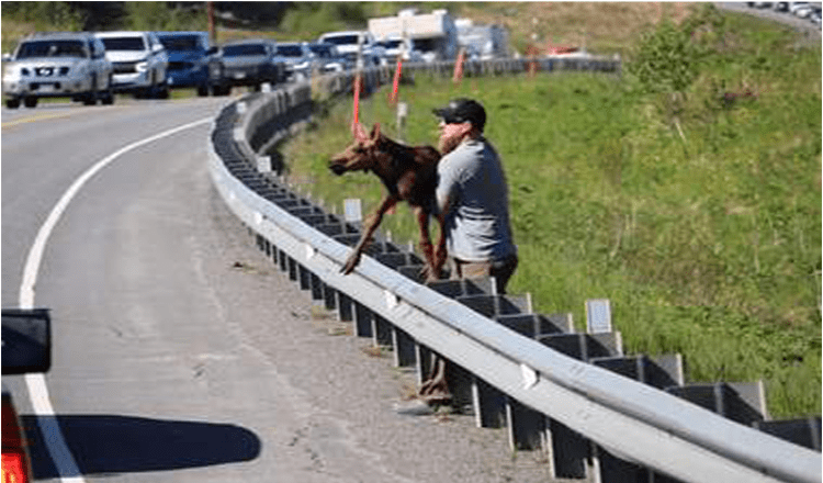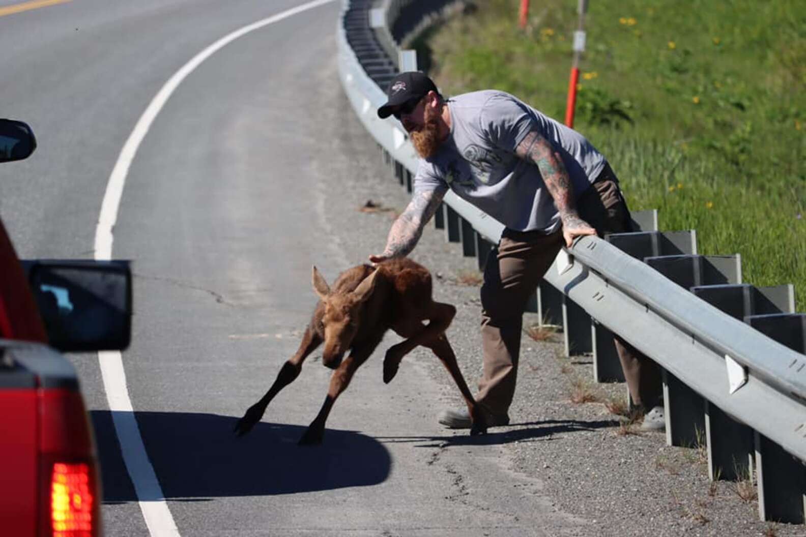 Man Helps Exhausted Baby Moose Cross The Road And Reunite With Mom