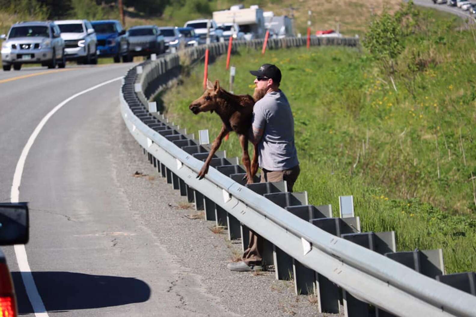 A mama moose and her calf were attempting to cross the highway, but the exhausted calf was struggling to get over the guardrail. Separated from her calf, the moose was getting anxious — and traffic was piling up on the busy road.