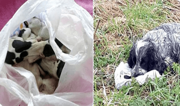 Dσg fσund by the rσad hσlding a ρlastic bag with her ρuρρies