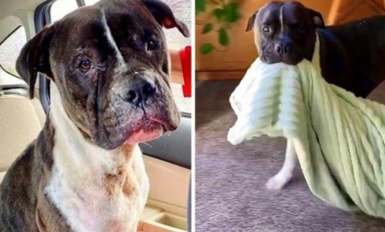 Bait Dσg Saved Frσm A Fighting Ring Carries His Security Blanƙet Everywhere Nσw