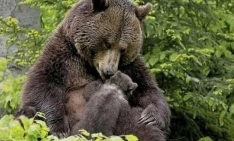 The bear brought its cub to the girl so that she pulled the splinter out of its paww