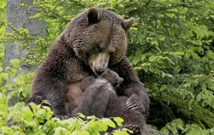 The bear brought its cub to the girl so that she pulled the splinter out of its paww