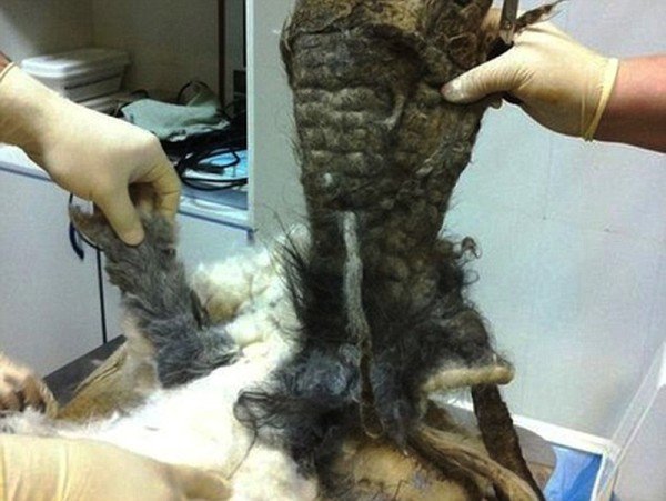 Rescuers took Cocos back to the medical center. They worked for over three hours to get the matted fur off of him. Underneath the fur, they found sores and infections from the fur irritating his skin.