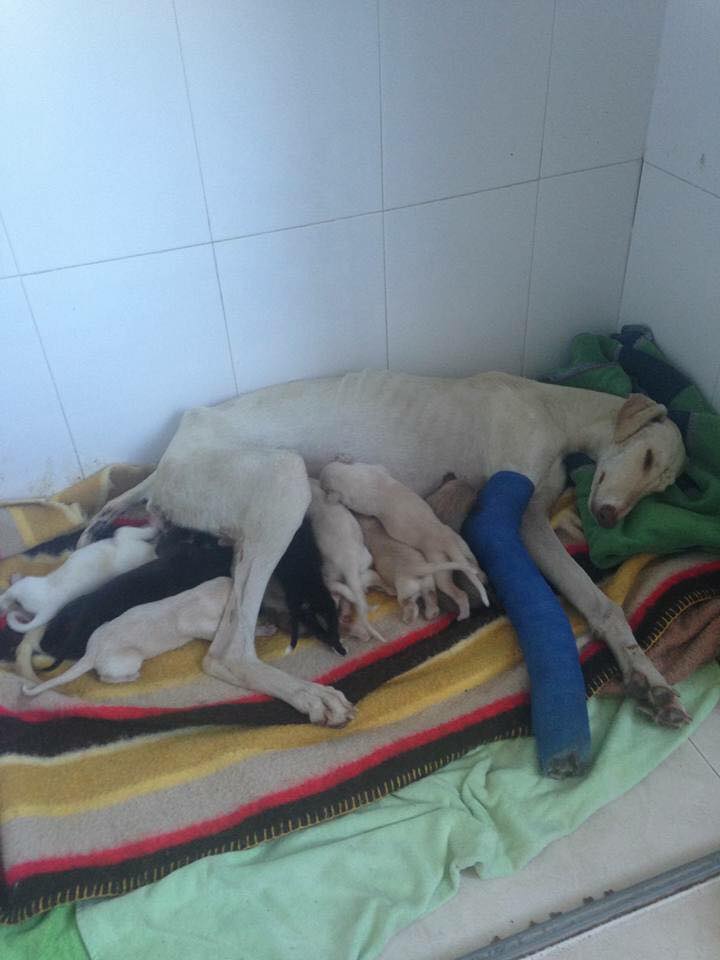 An injured stray Greyhound with a broken leg was found limping around, and rescuers soon realized what she was fighting to live for – she was a mother.