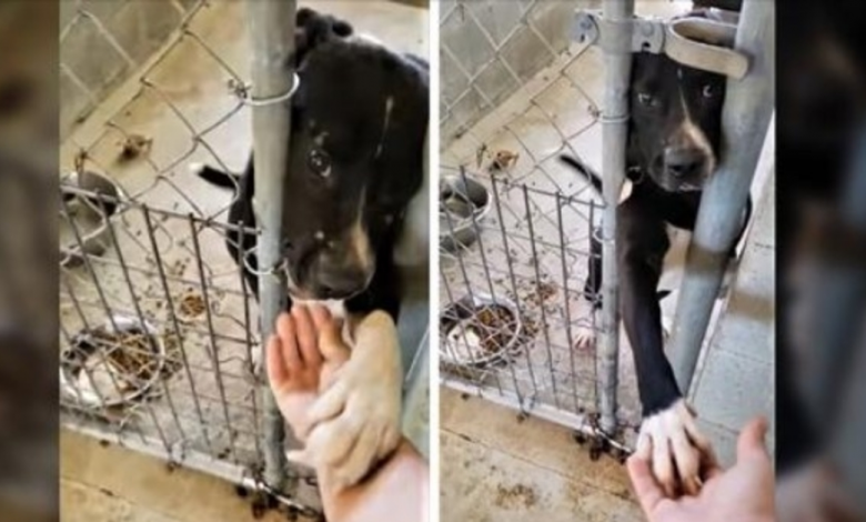 Shelter Dog Desperate For Adoption Tries To Hold Hands With Everyone Passing By His Kennel