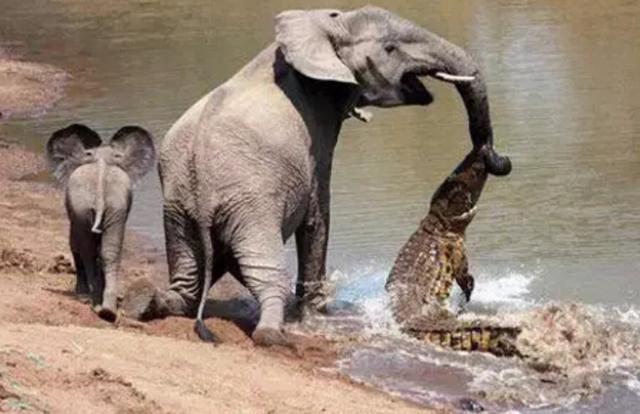 The calf elephant knows that it has to do something to save its mama, so, it jumps on the reptile to give its mama a better chance to survive.