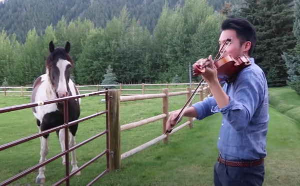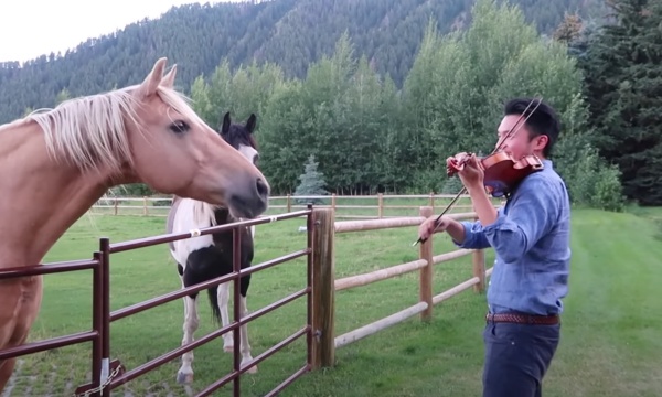 Chen is joined by two beautiful horses who entranced by his musical magic. As he plays Vivaldi’s famous piece called “Four Seasons,” the horses come closer and appear to be soothed by the beautiful notes from Chen’s violin.