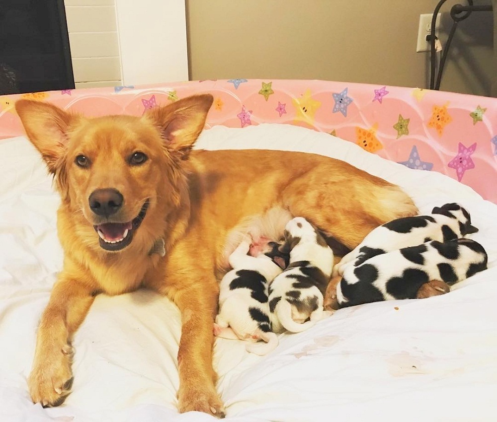 Unlike the gold-coated mama Rosie, the puppies were a spotty lot. The black and brown marks on their white fur made them eerily resemble a bunch of tiny baby cows! Fittingly, they were given the bovine names of Daisy, Clarabelle, Betsy, and Moo.