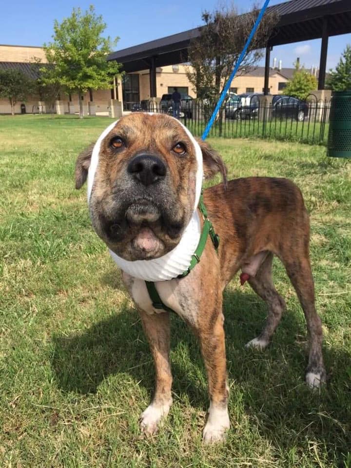 They immediately brought him to a vet for medical care and then took him to a soft-tissue specialist where he underwent surgical removal of the scarred tissue. After surgery, his swollen head finally shrunk back to a normal size.