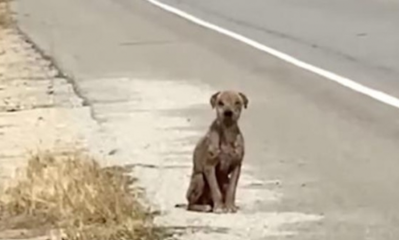 Scared & Sad Dog Sitting By The Side Of The Road Missing His Shiny Coat Seeking For Love