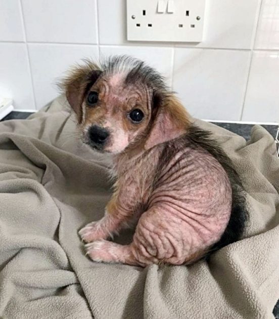 The puppy, initially named Honey, was left practically bald after all of her fur fell out, due to a nasty case of mange. She was brought into the vet’s office by her previous owners, who had neglected the sweet pup for far too long.