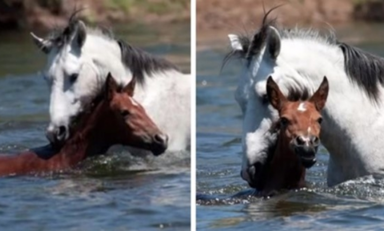 He took the [distre.ssed] foal under his wing and protected her until she reached the safety waters, and then eventually the banks on the other side of the river.