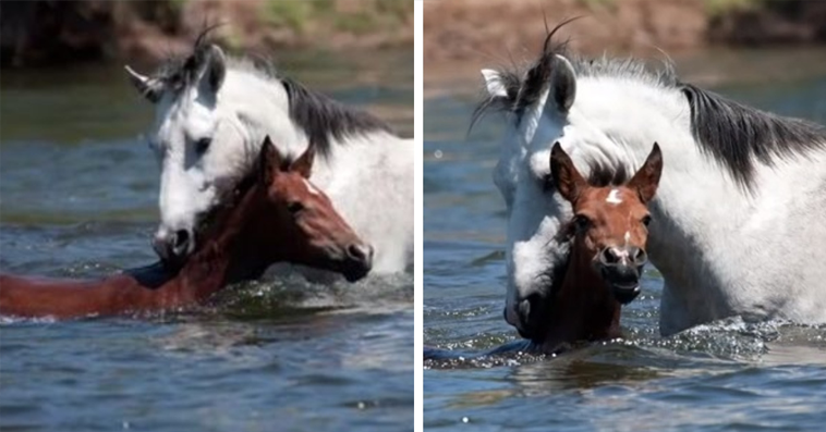 When noticing the young horse was really struggling to keep her head afloat, the massive stallion approached her and guided her to the right direction.