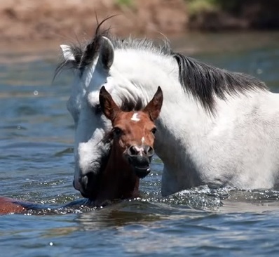 This it was a wild stallion that stepped up and saved the day, when a young and unexperienced foal struggled to cross a river.