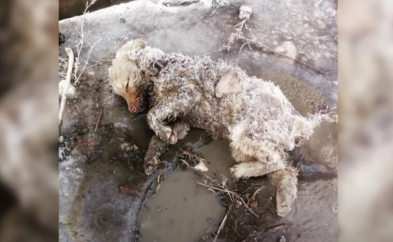 A woman was on her way to work on a very cold day when she spotted a dog lying on the ground. Her body appeared stiff and when the woman leaned down to touch her, she was ice cold. Assuming the woman was too late, she cried for the poor dog that had to die alone. But as the woman wept, the dog suddenly moved, writes ilovemydogsomuch