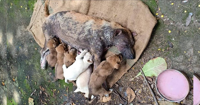 A good citizen spotted this poor dog family in a garbage pile. The mama dog was in very bad condition. She could not even stand up but she tried to feed her babies, writes xaga
