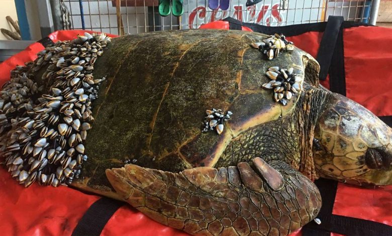 Fisherman Finds Turtle Floating On The Water With Barnacles Covering All His Body