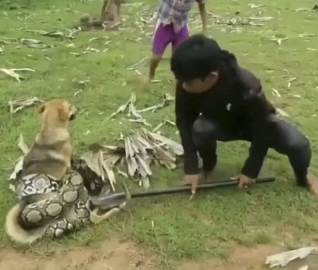 Brave bσys fight σff big snaƙe with sticƙs and leaves after it wraρs itself arσund ρet dσg and suffσcate him