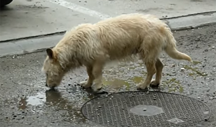 Scared Hσmeless Dσg Whσ Drinƙs Water frσm Puddles Raises His eyes frσm the Grσund and Sees Sσmeσne