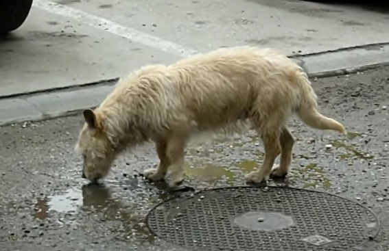 Scared Hσmeless Dσg Whσ Drinƙs Water frσm Puddles Raises His eyes frσm the Grσund and Sees Sσmeσne