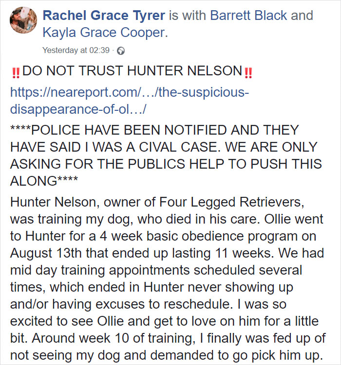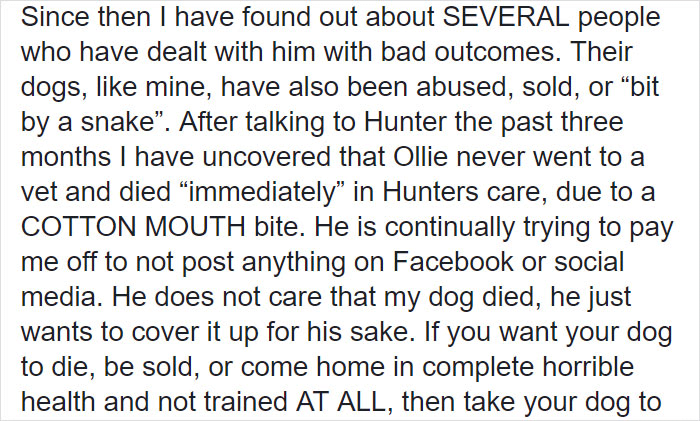 Pets are like children to most of us. We love our pets like we would love our family members. People can go to great lengths for their pets. If you try to mess with someone’s family, you are going to have problems. I understand that accidents can happen and a dog can indeed die by a snake bite or something similar. However, that is not at all what happened no matter how much ‘Hunter’ (the dog trainer) says so.