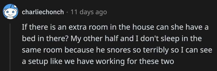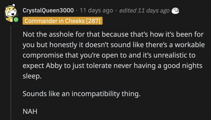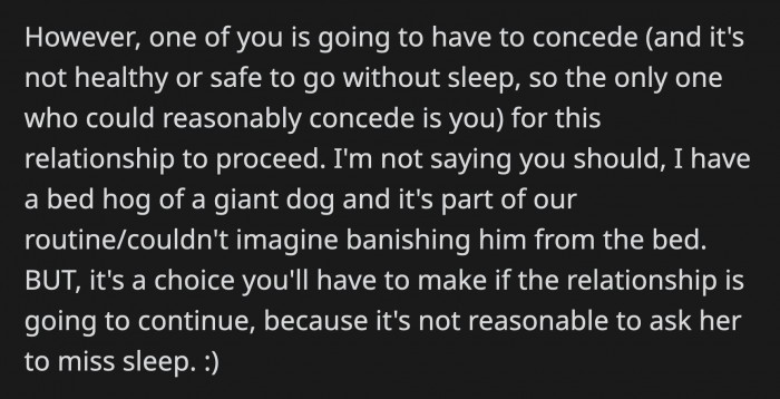 I can understand where he is coming from. After all, it is hard to make changes in your life. And expecting someone to stop doing what they have been doing for years is not really so simple. Not only that but, there is nothing wrong with letting your pets sleep with you on the bed. However, there is also nothing wrong with wanting to feel comfortable while you are sleeping and she clearly isn’t getting enough sleep. So they are at a standstill.