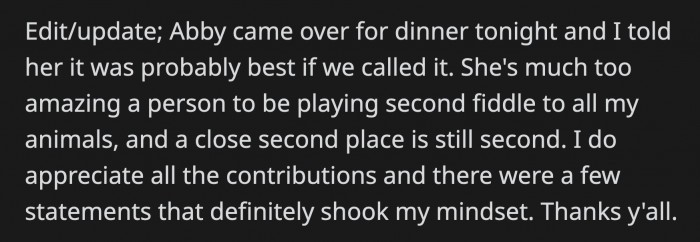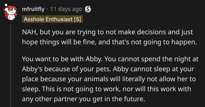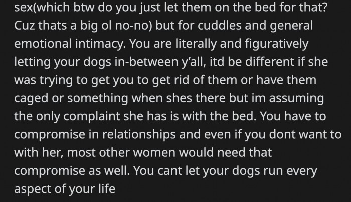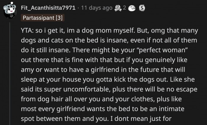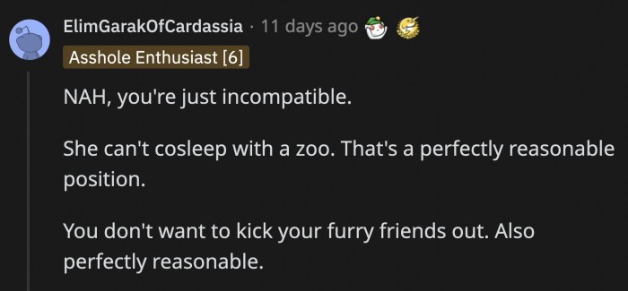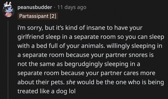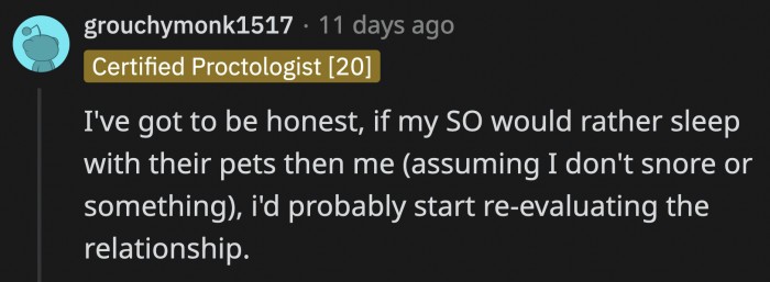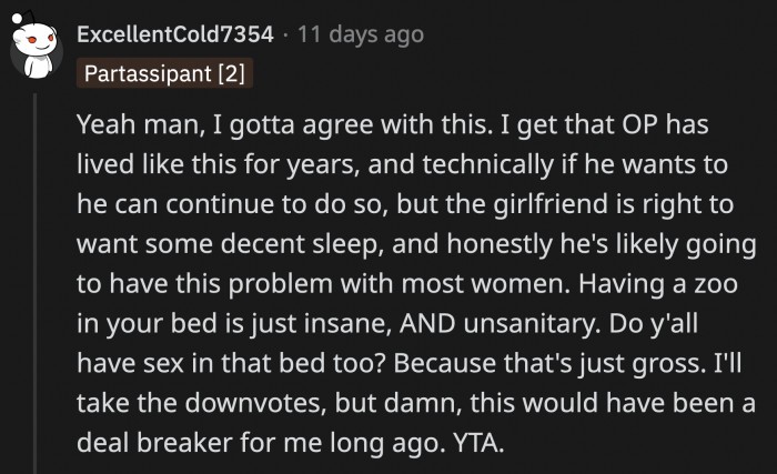 And even though I absolutely adore most animals, even I would not be comfortable sleeping with seven pets on the bed. There wouldn’t even be enough space for me so I can understand where this guy’s girlfriend is coming from. I am not saying that there is anything wrong with letting your pets sleep with you but, it isn’t for everybody. And sometimes you have to compromise with your significant other if you want to make the relationship work.