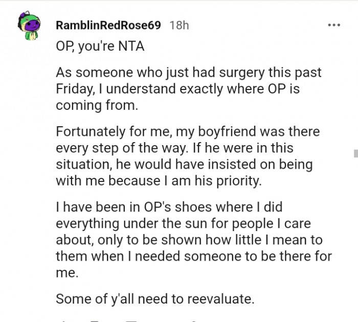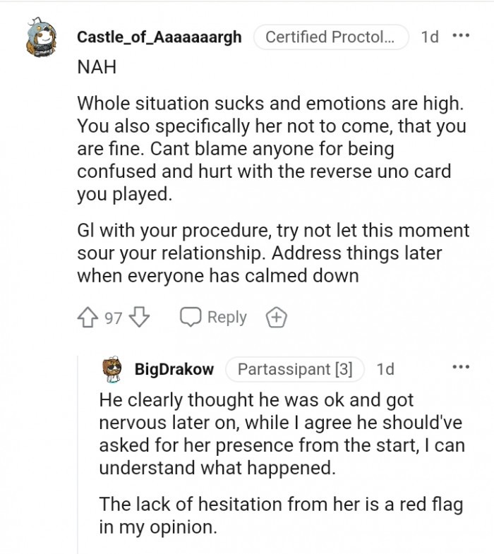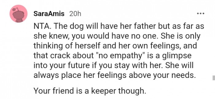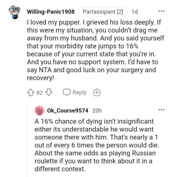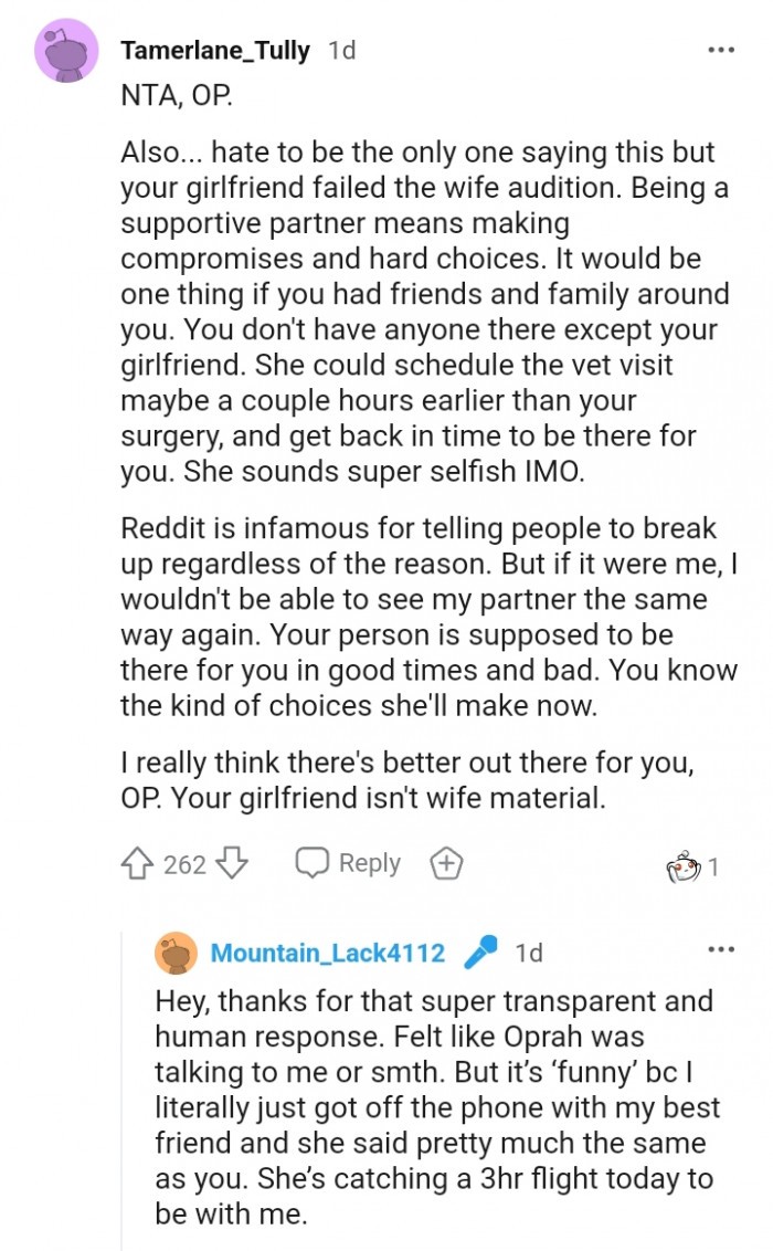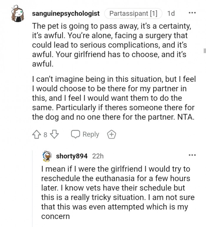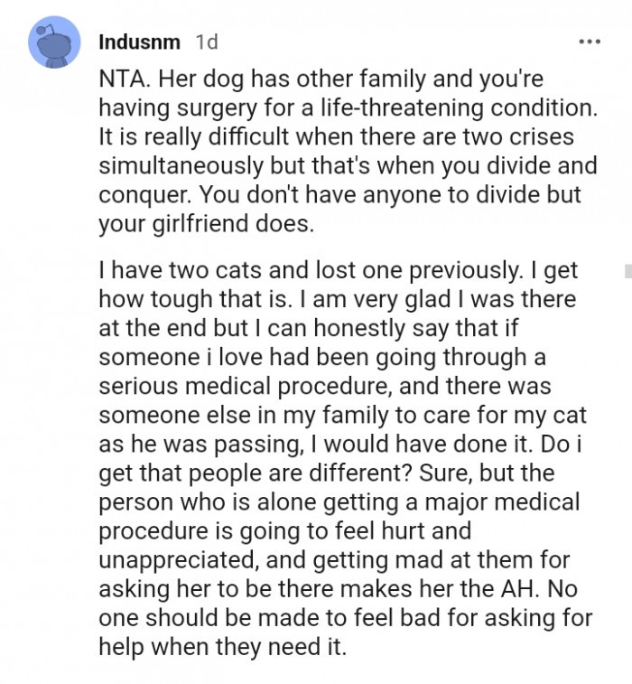 But that’s only true if you genuinely care for your partner. If not, then it’s essential to scrutinize your relationship closely. That’s not to say that I don’t understand where she is coming from. After all, her dog is facing euthanasia, and that must be a devastating feeling to cope with. The pain she is going through is unimaginable. However, her partner is also facing a challenging situation as he is soon going through surgery, and it’s evident that he’s scared.