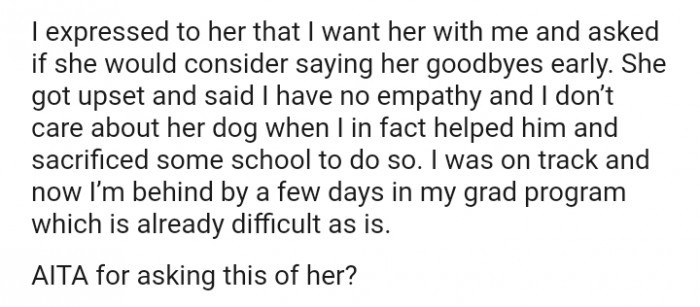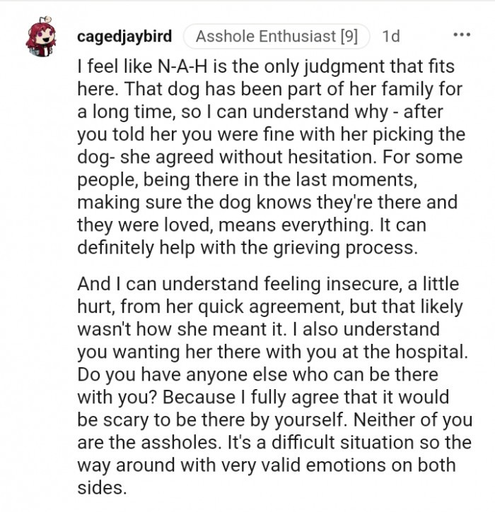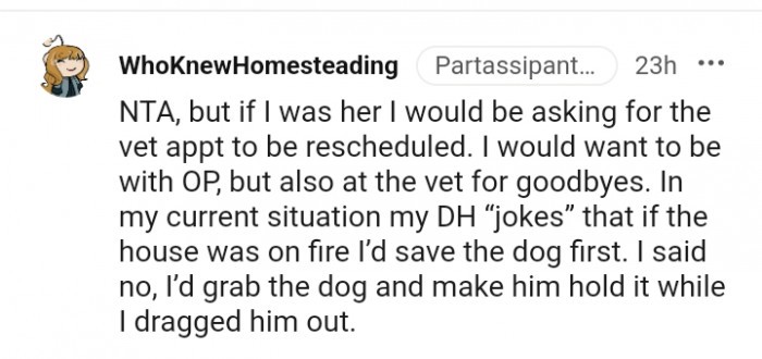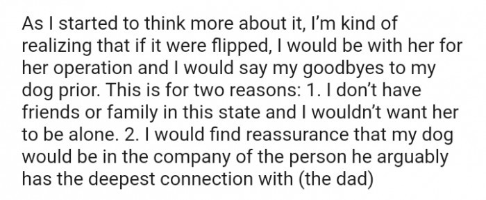 This is genuinely a complex situation, and I’m unsure of what the right decision is here. People can share their opinions, but we don’t know the intricacies of their relationship. While it’s evident that he has gone above and beyond for the family and the doggo, the same cannot be said for her. Yet, she is also facing a difficult time. Would it have been better if she reassured him and rescheduled the doggo’s appointment? Perhaps, but I can’t say for certain.