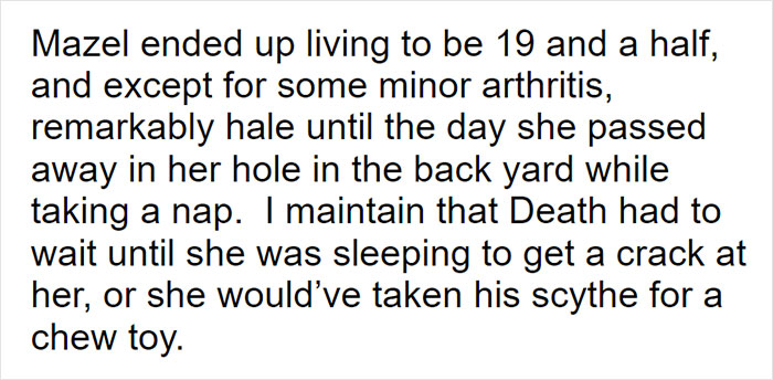 6. The way OP described the animal, anyone would want to adopt it. Even the husband fell in love with it instantly. Mazel is officially part of the family.
