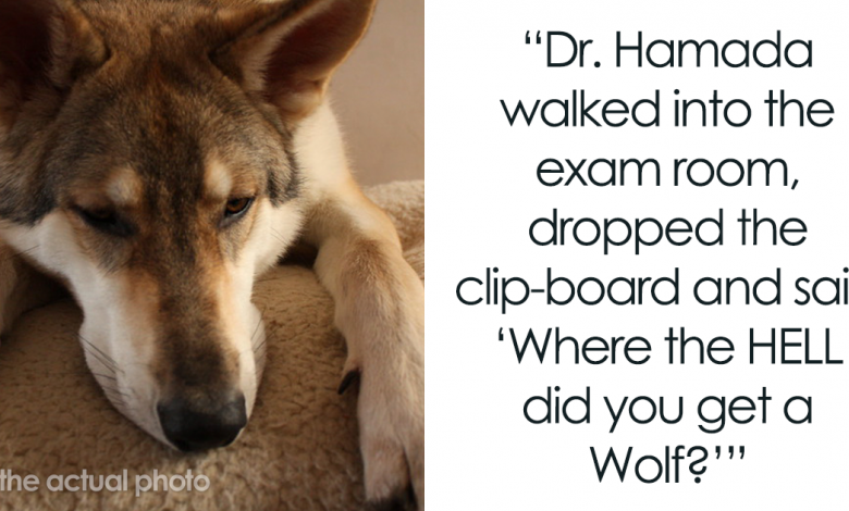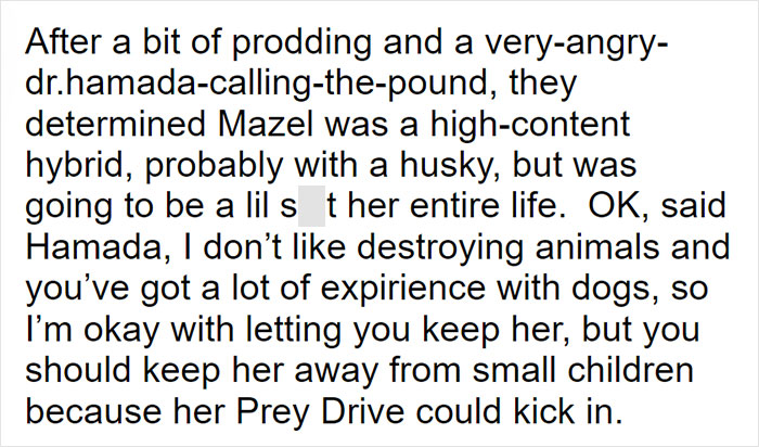 10. So Mazel is a wolf-husky mix. And the vet allowed them to keep the wolf, but with a lot of care.